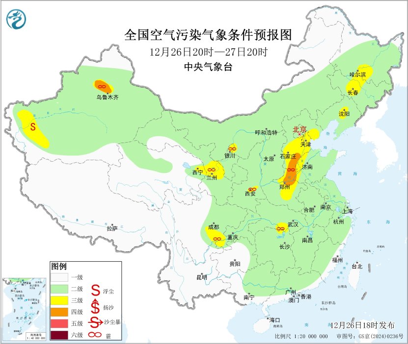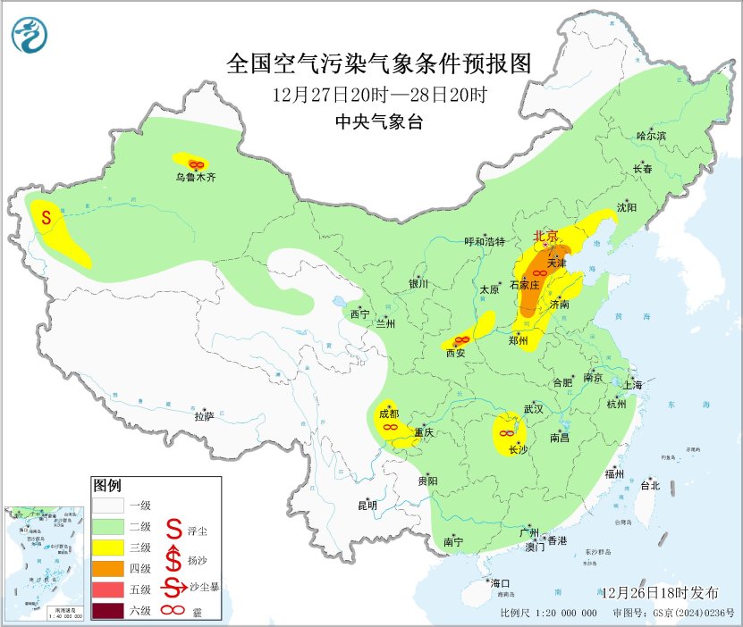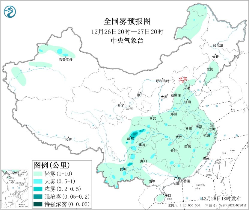此外,26昼夜间至27日上昼,新疆天山北坡、四川盆地北部和西部有大雾天气,局地有能见度不及200米的强浓雾。