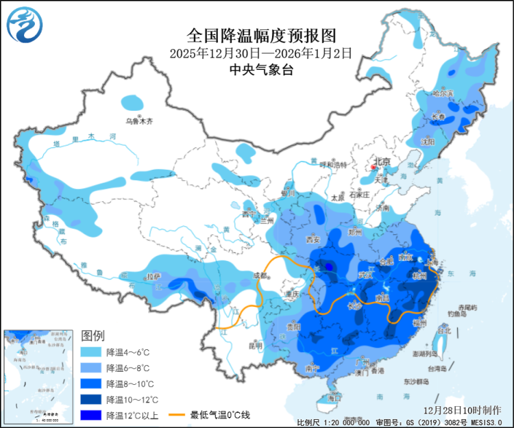 12月30日至1月2日,受强冷空气影响,中东部大部地区气温将下跌6~8℃,江南东部、江汉西部、华南北部等地部分地区气温下跌10℃以上,1月3日黎明最低气温0℃线将南压至江南中部一带。上述部分地区伴有4~5级风,阵风6~8级;东部和南部海域有6~7级风,阵风8~10级,东南部海域局部阵风11级。