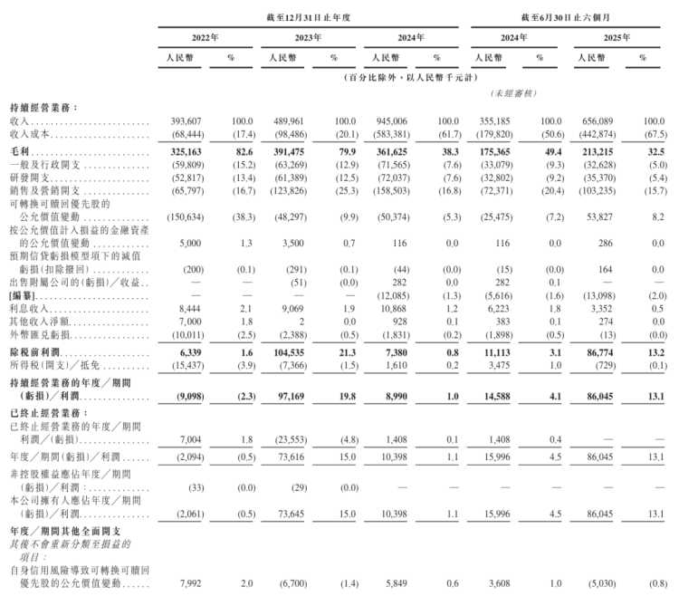 野蛮健康集团2025年上半年营收为6.56亿元,较上年同时的3.55亿元增长84.8%;毛利为2.13亿元,上年同时的毛利为1.75亿元;毛利率为32.5%,上年同时的毛利率为49.4%。